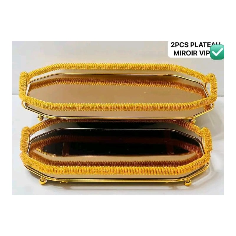 Les plateaux élégants en métal sont dorés et ont une base en verre miroir. Elles sont utilisées pour décorer un style classique ou élégant.