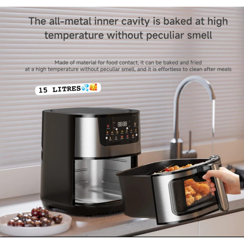Cette friteuse à air électrique de 15 litres est une alternative saine et pratique à la friture traditionnelle, car elle vous permet de cuisiner vos aliments préférés sans huile ni graisse ajoutée.