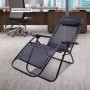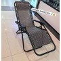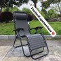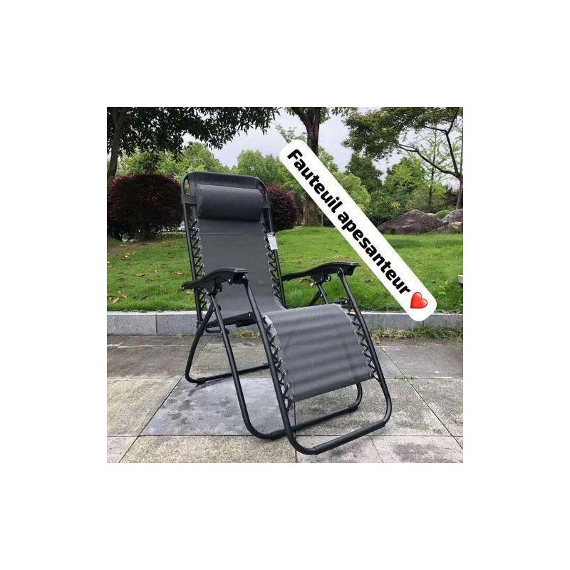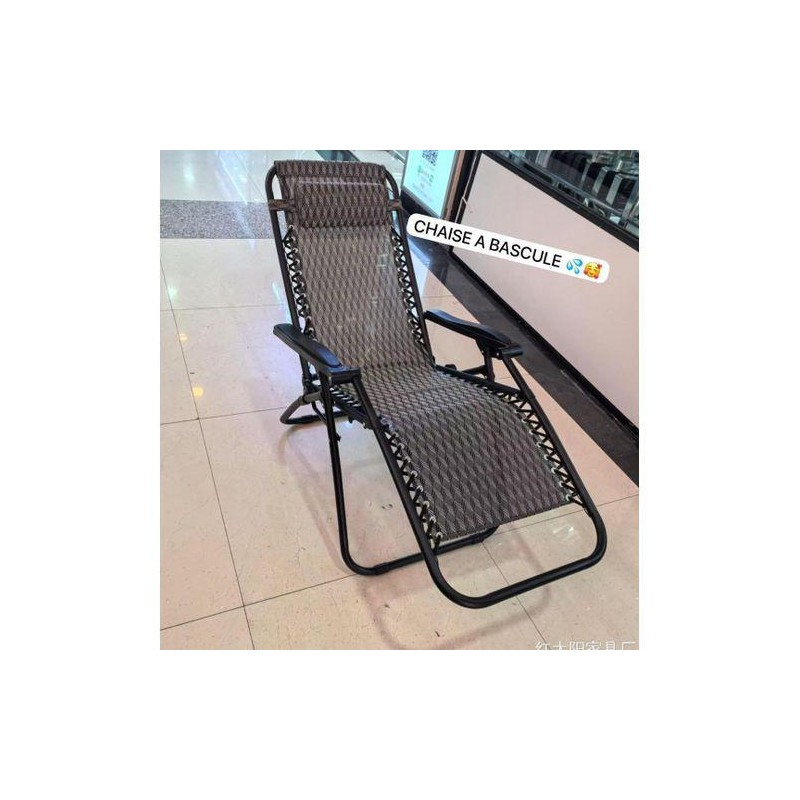 Chaise pliante, à bascule en métal noir avec un siège et un dessous en tissu. Il est également équipée d'un appuie tête rembourrée.