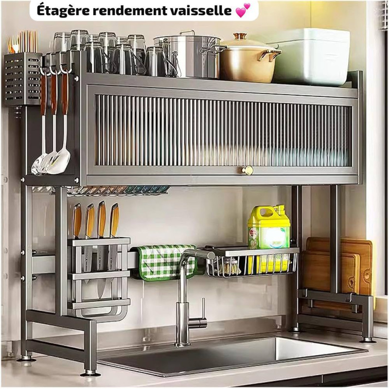 Égouttoir et rangement à vaisselle à 2 niveaux en acier inoxydable.