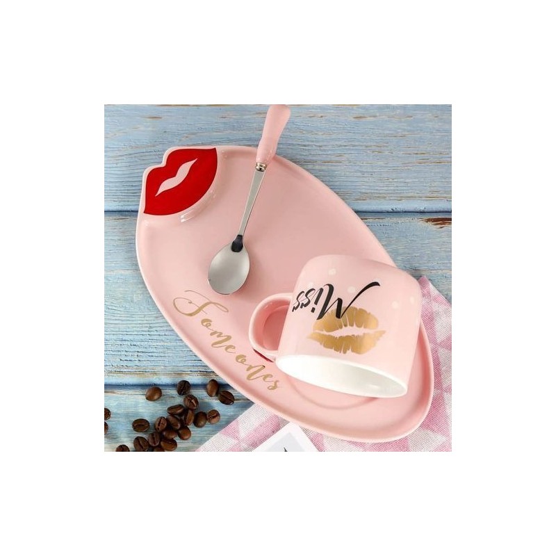 Love Tasse à café créative en céramique, tasse à thé, soucoupe et cuillère, tasse à thé de l'après-midi, cadeau idéal (rose)