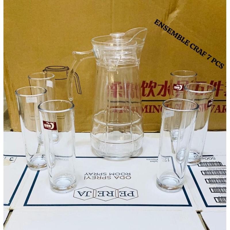 Ensemble de 7 pièces- Carafe et verre à eau avec couvercle.